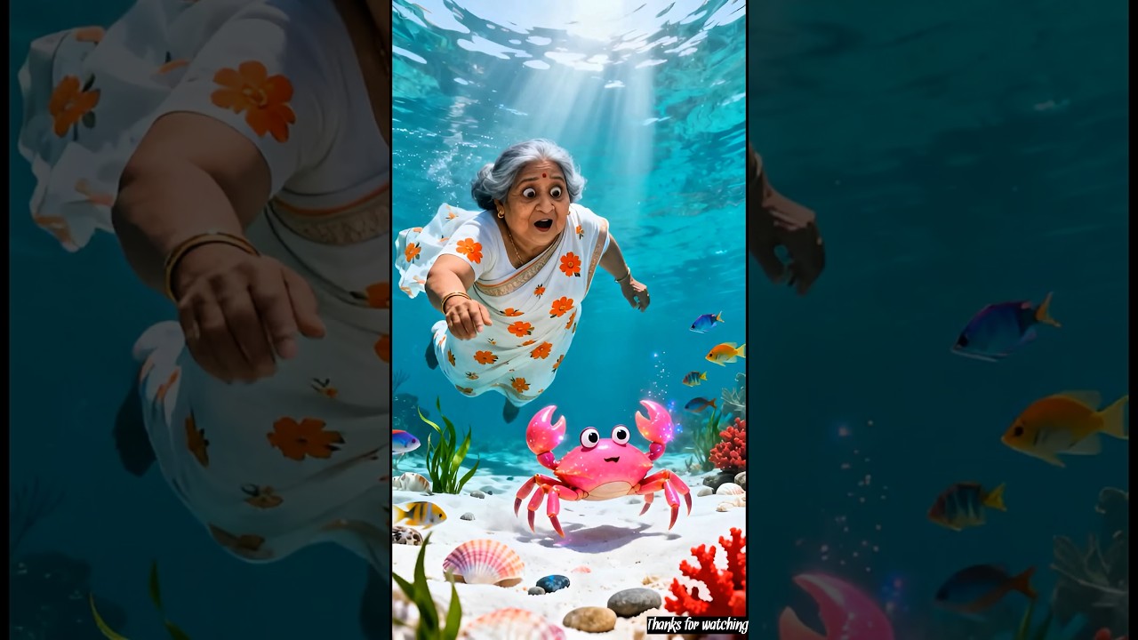 দাদি সমুদ্রে একটি গোলাপী রঙের কাঁকড়া খুঁজে পায়