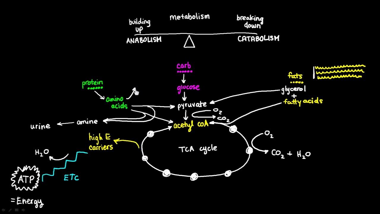 An introduction to metabolism explaining catabolism, anabolism, and how carbohydrates, proteins, and fats are processed for energy and storage.