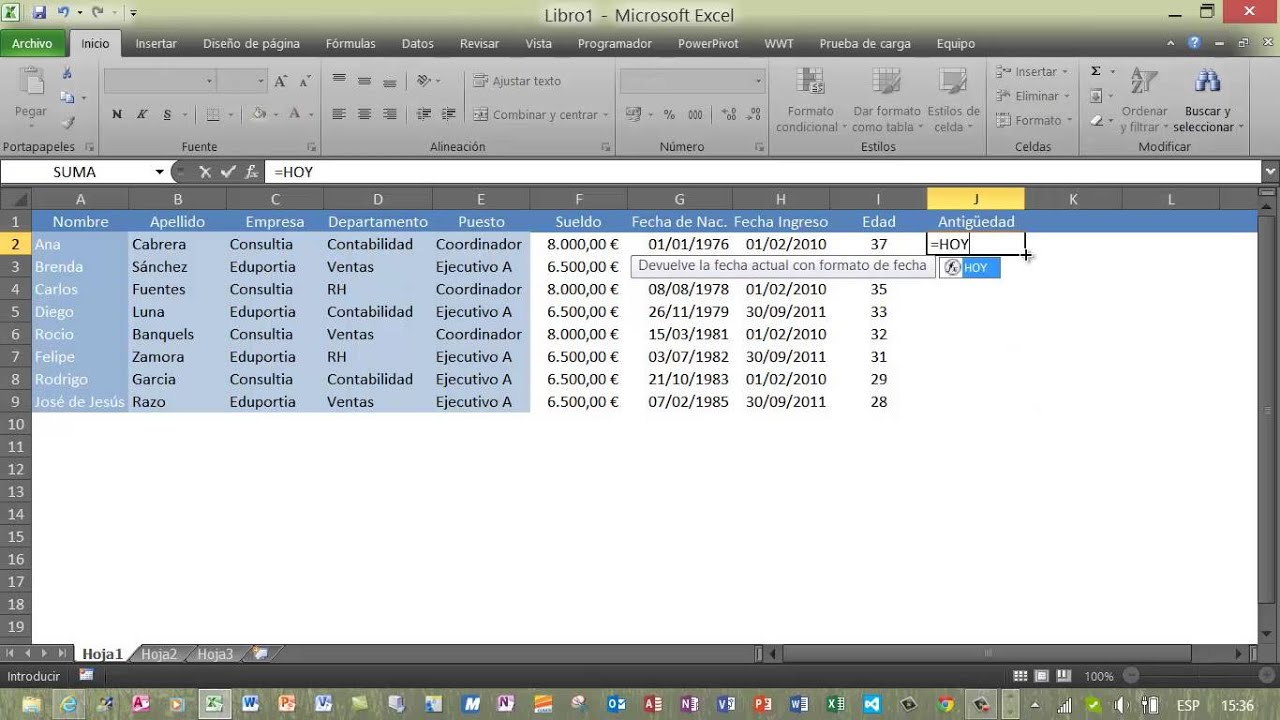 - La función HOY permite calcular edades y antigüedades actualizadas automáticamente.