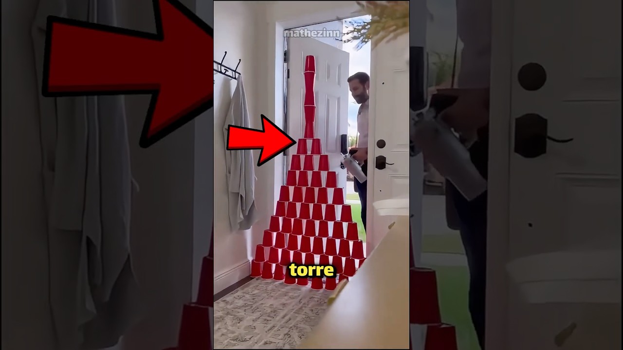 Os filhos montaram uma torre gigante de copos vermelhos na porta para pregar uma pegadinha no pai quando ele chegasse em casa.