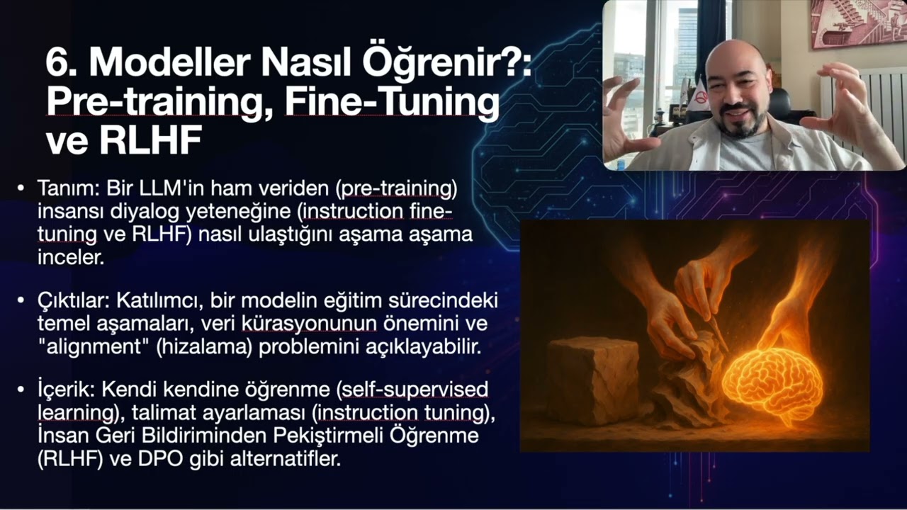 - Pretraining (ön eğitim), fine-tuning (ince ayar) ve RLHF (Reinforcement Learning with Human Feedback) kavramları detaylandırılıyor.