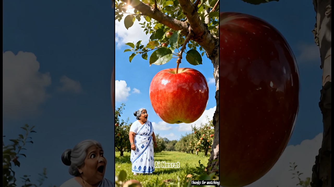 দাদি আপেল বাগানে কাজ করতে গিয়ে একটি বড় আপেল দেখতে পায়।