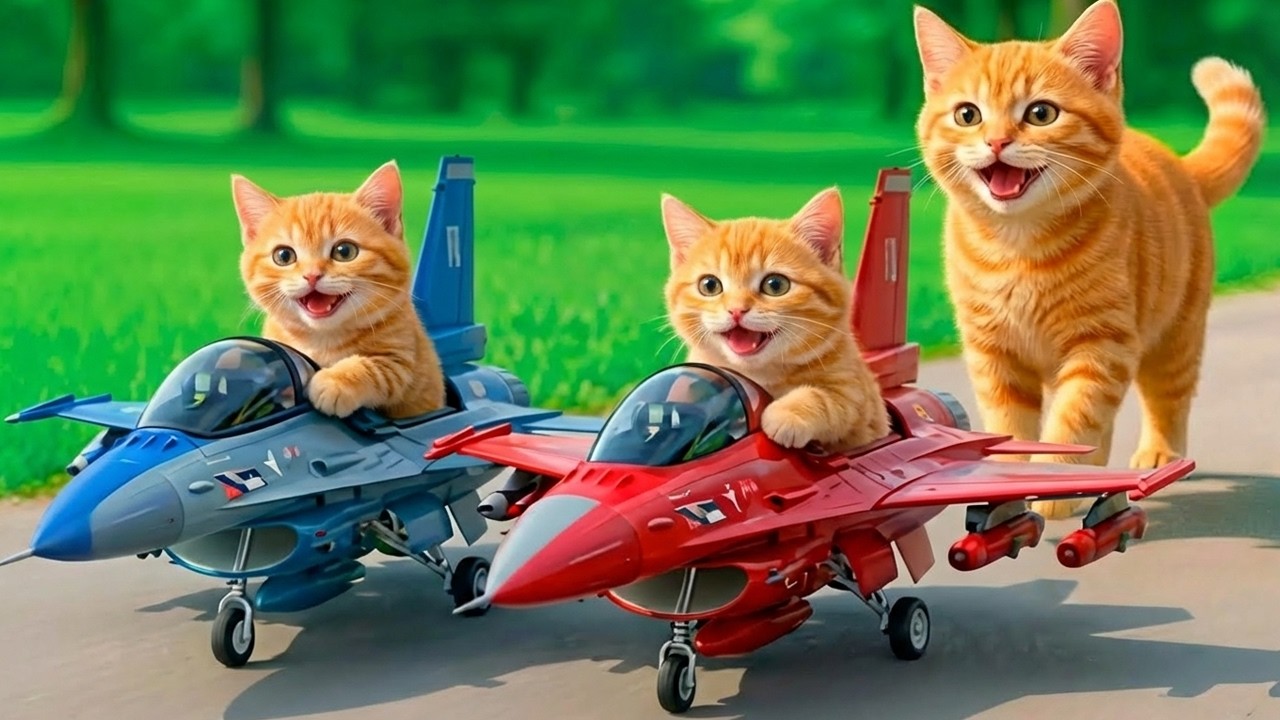 - The video features animated kittens driving red and blue super fighter jets.