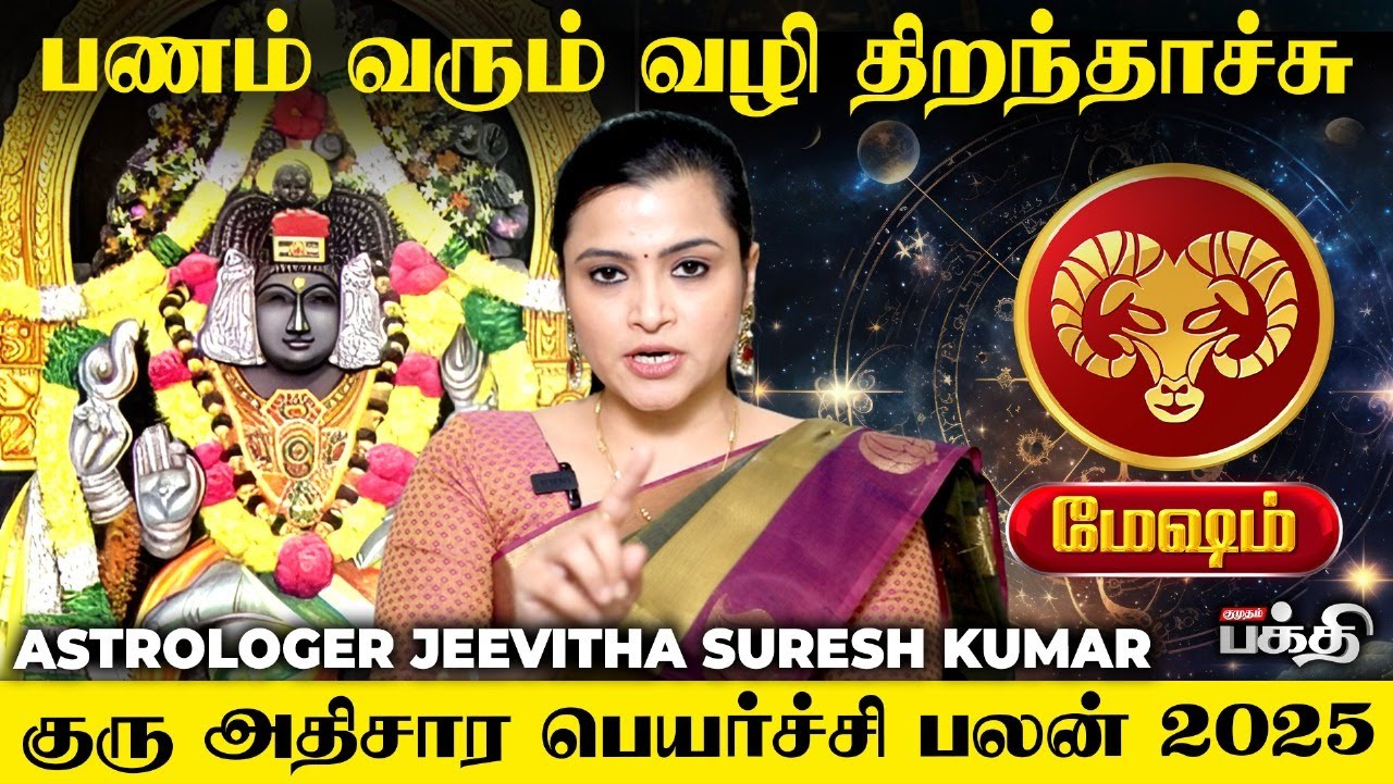 மேஷ ராசிக்காரர்களுக்கு 2025 குரு அத்திசார பெயர்ச்சி மூலம் பணம், வளர்ச்சி, குடும்ப நலன் மற்றும் ஆன்மீக பரிகாரங்கள் பற்றிய விளக்கம்.