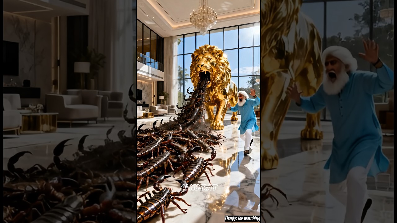 ঠিক তখনই সোনার সিংহটি ধীরে ধীরে বিশাল বড় হয়ে যায় এবং মুখ দিয়ে হাজার হাজার বিচ্ছু বের করতে শুরু করে দাদা ভয়ে চিৎকার করতে শুরু করে।