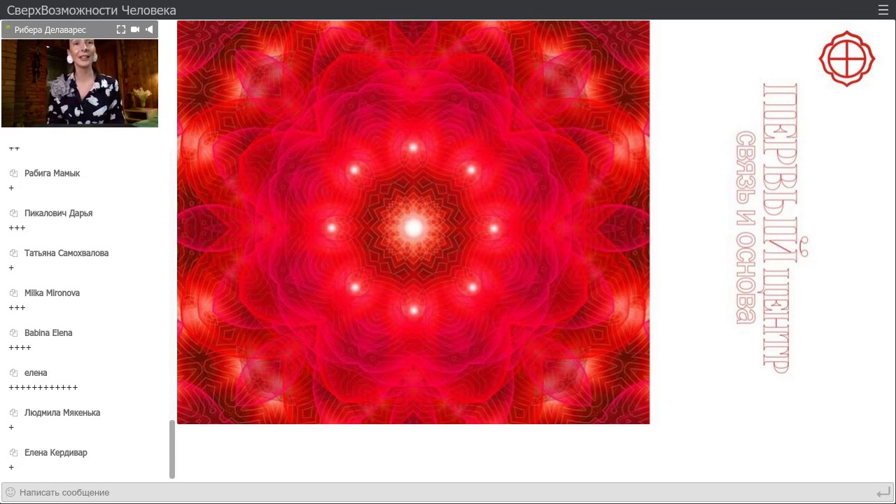 В семинаре выполняются дыхательные упражнения с плавным вдохом и выдохом, а также расслабление головы и глаз с концентрацией на первой чакре.