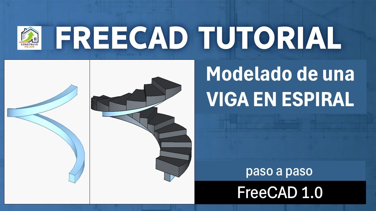 Tutorial para modelar una viga de soporte en espiral usando FreeCAD, combinando Sketcher, Part y BIM para escaleras de vivienda.