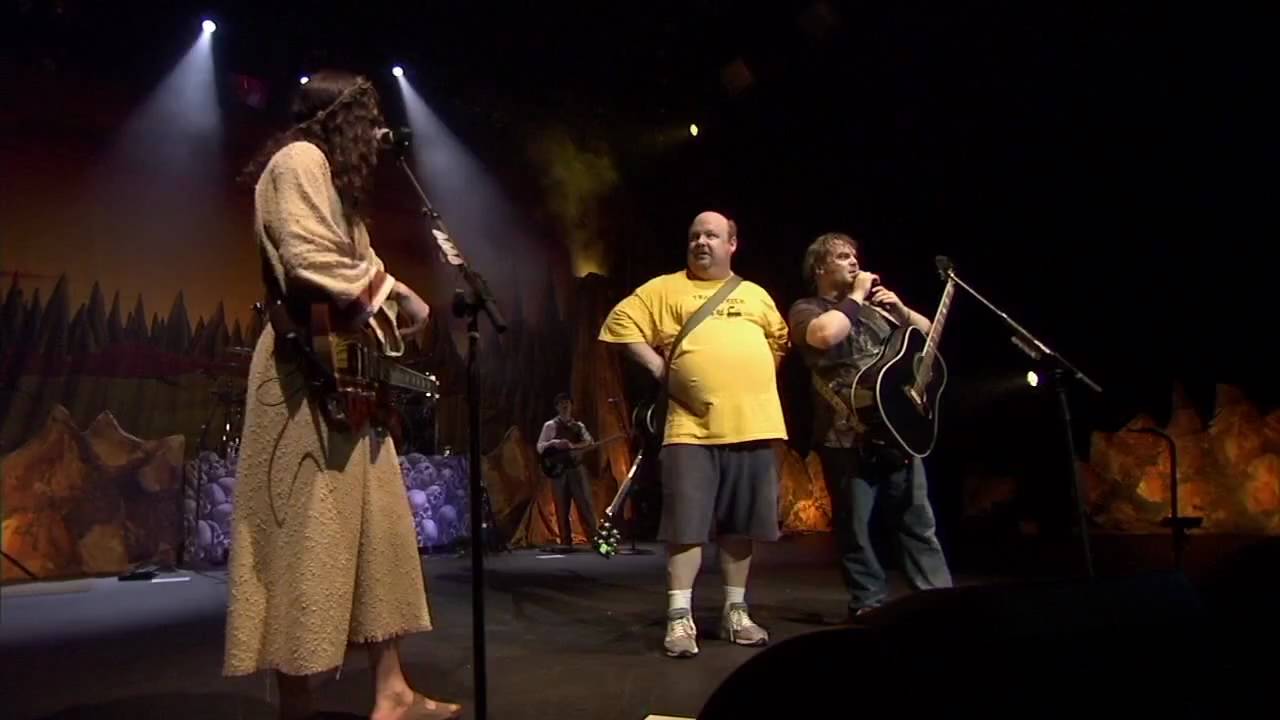 Live performance of Tenacious D's 'Beelzeboss' featuring a comedic dialogue with Satan in hell.